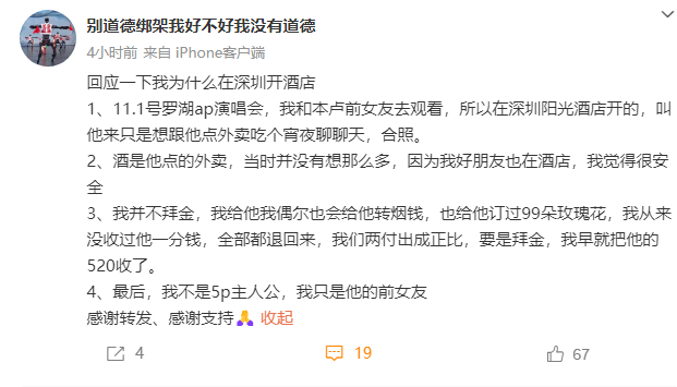 对于喝酒后发生关系的问题,这名女生回应道:“酒是他点的外卖,当时并没有想那么多,因为我好朋友也在酒店,我觉得很安全。”