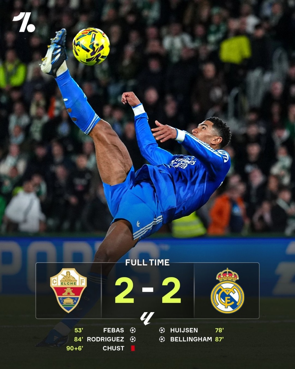 西甲第13轮,皇马客场2-2战平埃尔切,联赛两连平,仅1分优势领跑。费巴斯首开纪录,赫伊森扳平,打进皇马生涯的首个进球,阿尔瓦罗-罗德里格斯打进一球,贝林厄姆第87分钟绝平。