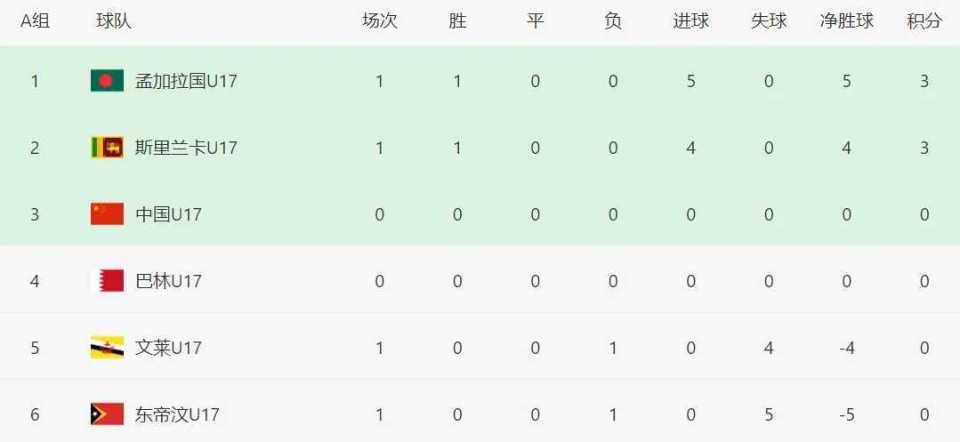 孟加拉国以5个净胜球的优势,力压中国队排名榜首。