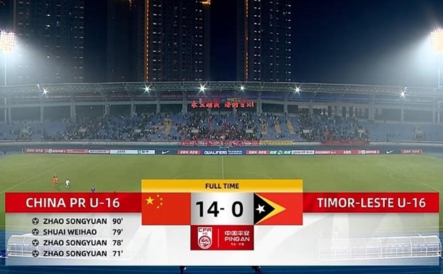 北京时间11月24日晚间,U17亚洲杯预选赛A组第二轮,中国男足对阵东帝汶。上半场,张伯霖、谢晋都打进了两球,中国队已经6-0遥遥领先。下半场,谢晋打进个人第三球,帅惟浩、赵松源也都是上演了帽子戏法。最终,中国男足制造了一场超级惨案,以14-0屠杀东帝汶!