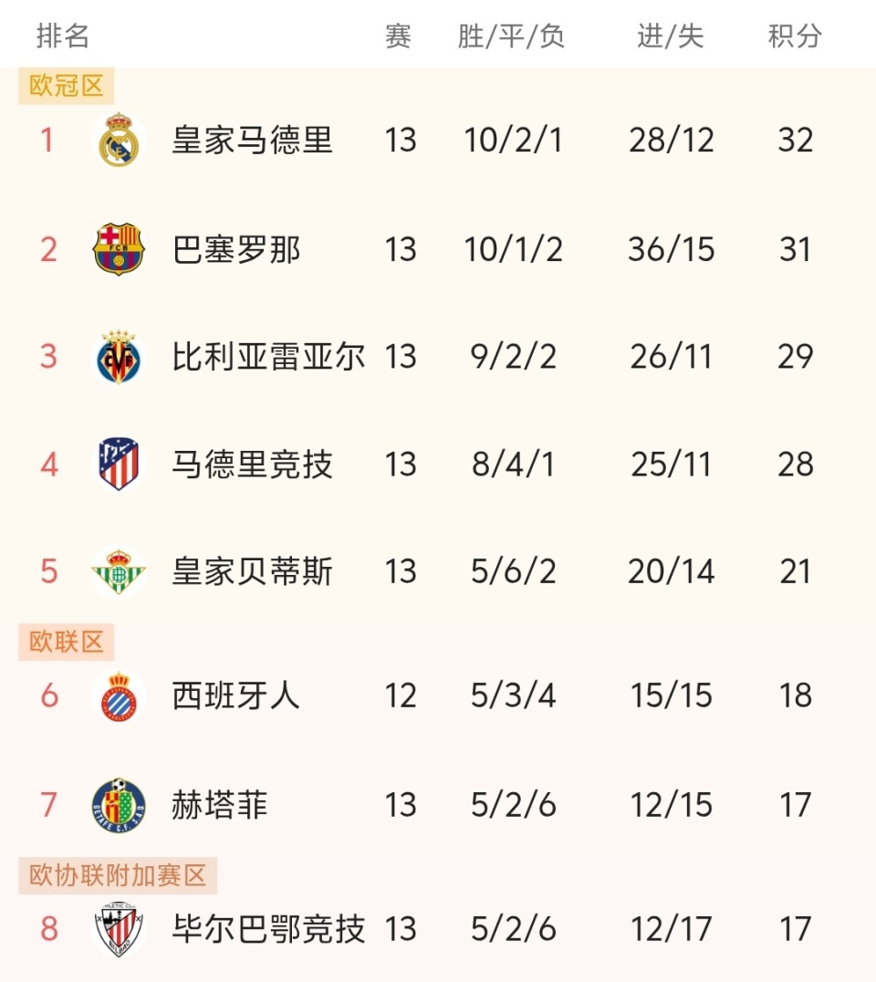 随着皇马2-2爆冷,巴萨大胜,西甲最新积分榜出炉:皇马1分领跑,巴萨第二!