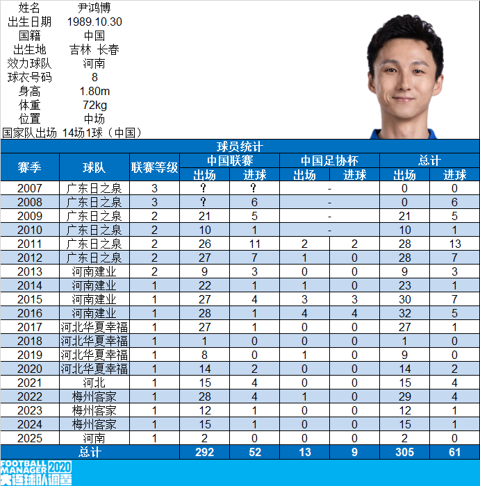 巅峰时期的尹鸿博也是国家队常客,跟随国足征战过世预赛、东亚杯、国际友谊赛。国家队生涯中,他累计出场14次,打进1球,送出6记助攻。