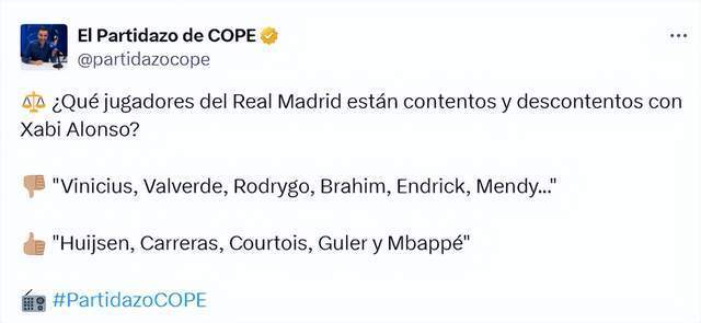 “对阿隆索不满的球员,有维尼修斯、巴尔韦德、罗德里戈、布拉欣-迪亚斯、恩德里克、门迪……”