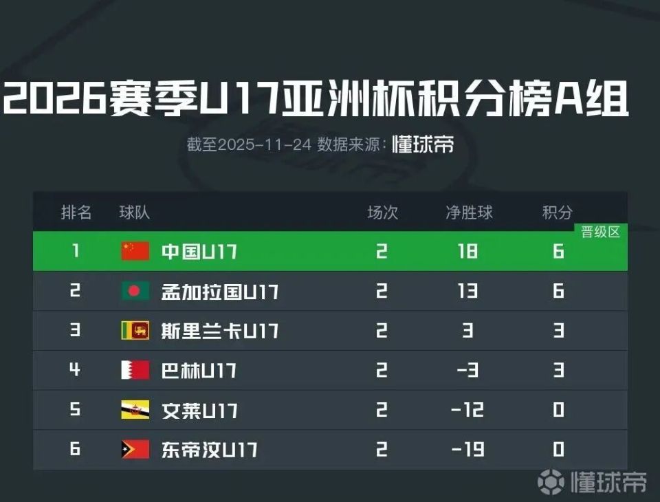 小组赛前两轮战罢,中国队先后以4比0和14比0战胜巴林队和东帝汶队,以进18球0失球的成绩力压手握13粒净胜球的孟加拉国队,暂时排在小组第一。