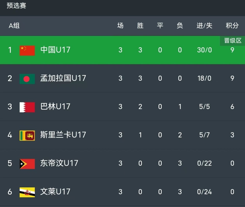 在U17亚预赛积分榜上,中国队3战全胜轰30球不丢一球,积9分继续领跑;孟加拉国同样3战全胜,净胜球18个位列第2位。11月28日19点05分,中国队将对阵斯里兰卡。