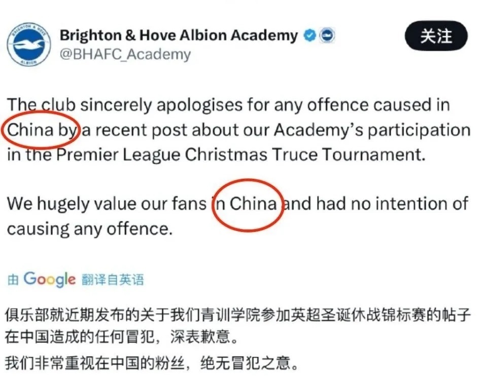 布莱顿将这张照片发到官方社媒,结果遭到中国球迷的猛烈批评,随后,俱乐部删除照片并道歉:“针对近期发布的帖子在中国造成的任何冒犯,俱乐部深表歉意。我们非常重视中国的球迷,我们绝无冒犯之意。”