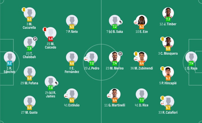 切尔西首发:1-桑切斯、27-古斯托、29-福法纳、23-查洛巴、3-库库雷利亚、24-詹姆斯、25-凯塞多、41-埃斯特旺(46'49-加纳乔)、8-恩佐、7-内托、20-佩德罗(55'9-德拉普)