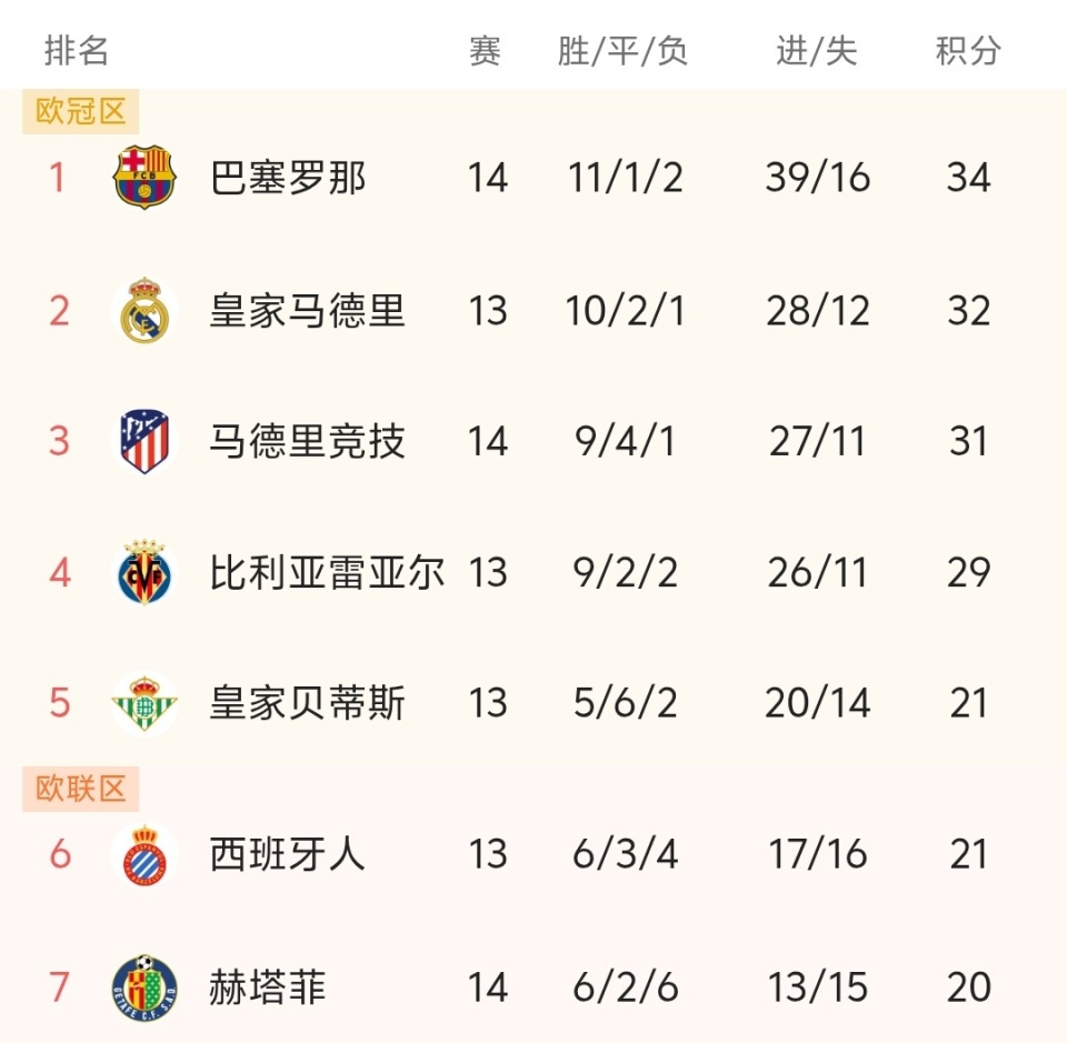 北京时间11月30日,西甲联赛第14轮开打,巴塞罗那主场3-1逆转击败了阿拉维斯,他们在积分榜上暂时超越了皇马,排名第1,皇马少赛一场以2分的劣势排名第2,马德里竞技主场2-0击败了皇家奥维耶多,暂时排名第3,现在巴萨和皇马之间的差距非常小,而且兜兜转转,马竞也追上来了,马竞本赛季开局是地狱级别的,如今终于又恢复了西甲三巨头的风采!