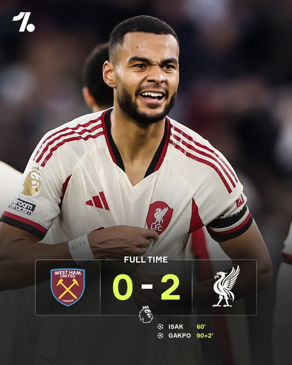 利物浦客场2-0击败西汉姆联,终结三连败。加克波助攻伊萨克推射打破僵局,帕奎塔两黄一红被罚下,加克波抽射锁定胜局。