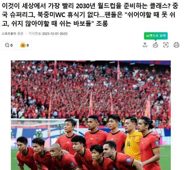 该媒体还大肆报道了明年中超将在世界杯期间照常进行的消息,直言这是一个完全合理的决定,因为中国队一如既往无缘明年世界杯,即使世界杯已经扩军到48支,但中国队还是无缘。可以说,现在韩国媒体也就只能从世界杯的角度挖苦一下中国男足了。(老邱)