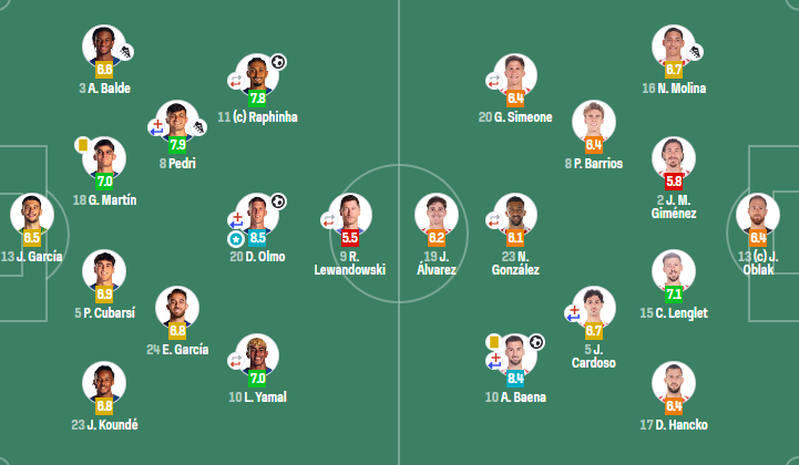 马德里竞技(4-2-3-1):奥布拉克;莫利纳,希门内斯,朗格莱,汉茨科;巴里奥斯,卡多索(14'科克,74'格列兹曼);小西蒙尼(63'索尔洛特),尼科-冈萨雷斯(46'加拉格尔),巴埃纳(63'阿尔马达);阿尔瓦雷斯