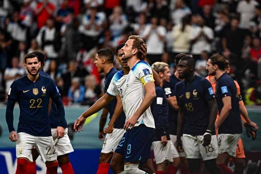 2022年卡塔尔世界杯,法国队与英格兰队在1/4决赛相遇,凯恩罚失点球,法国队2比1战胜英格兰队晋级四强
