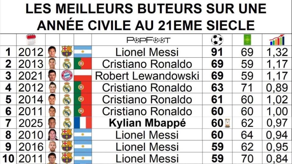 要知道他只用了69场比赛,场均进球数是1.32。时至今日,这是足坛所有前锋都无法触及的数字。换算到姆巴佩这里,是需要他在剩下的5场比赛当中打入31粒进球以上才行,这根本是无法完成的任务。所以姆巴佩接下来好好考虑把自然年进球排名提上去就好,至于第一那就不要想了。对于这份榜单,你们是怎么看的?