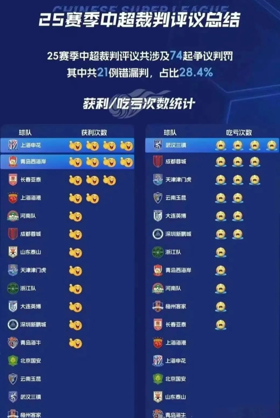 另外,上海海港作为本赛季冠军,其获利次数仅有2次,甚至不如长春亚泰。而客观来讲,海港有没有获利球迷也是非常清楚的,这其实只是评选出的进行评议的判罚,而且评议的结果其实也更像是在走走过场,在没有评议的判罚中,尤其是那些可判可不判的判罚中,海港又获利多少呢?