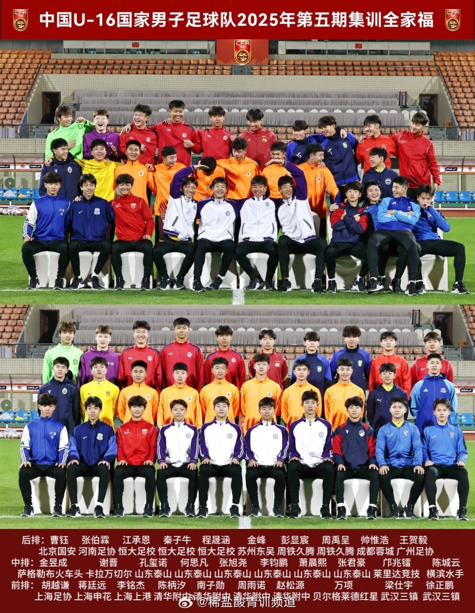 北京时间12月4日,据博主“稀盐酸青训频道”分享的照片显示,U16国少球员今年参加U17亚洲杯预选赛前集训时球员们身穿各自所属俱乐部训练服拍摄合照。