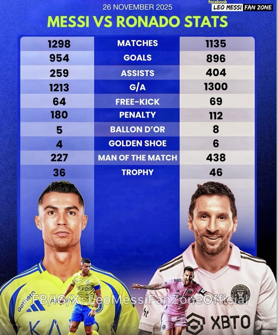 最近Leo Messi Fan Zone做了一张梅西和C罗职业生涯大对比,把出场、进球、助攻、任意球、点球、金球奖、欧洲金靴、全场最佳和冠军奖杯全都放在一张图里。结果一算下来,梅西在助攻、总进球加助攻、任意球进球、金球奖、欧洲金靴、全场最佳和冠军数量上统统压过C罗,数据已经全面反超,只剩出场、总进球和点球这几项还在被C罗守住。曾经“互相拉扯”的双骄,如今变成“一个全面领先、一个只剩少数项目在撑场面”,你觉得这是不是意味着,梅西已经真正把C罗甩在了身后?数据截至北京时间2025年11月26日。