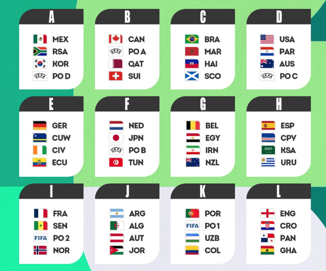 我们看看具体的分组情况(欧洲区还有4席、洲际附加赛还有2席):