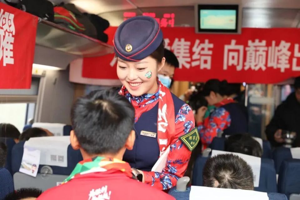G1801次列车旅客常女士:“以前都是自驾去看球,现在孩子大了,乘坐高铁更方便一些。很开心能坐上这趟‘球迷专列’,不仅氛围好、服务好,车厢内还干净整洁。孩子特别开心,说下次还想坐这趟高铁。”