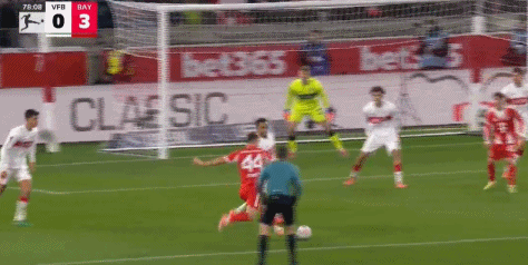 第79分钟,路易斯-迪亚斯回敲,斯塔尼希奇倒地射门,努贝尔送礼,拜仁遥遥领先,3-0!