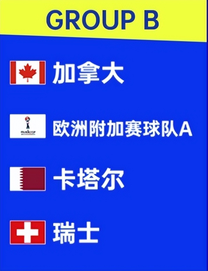 B组包括加拿大、欧预赛附加赛A选手(意大利VS北爱尔兰、威尔士VS波黑)、卡塔尔、瑞士。很显然,意大利会是大家极其期待的那个,只要他们可突破这附加赛的围栏,晋级正赛还是有机会的。“永远不要低估”意大利,是正赛每个对手的“教训”。