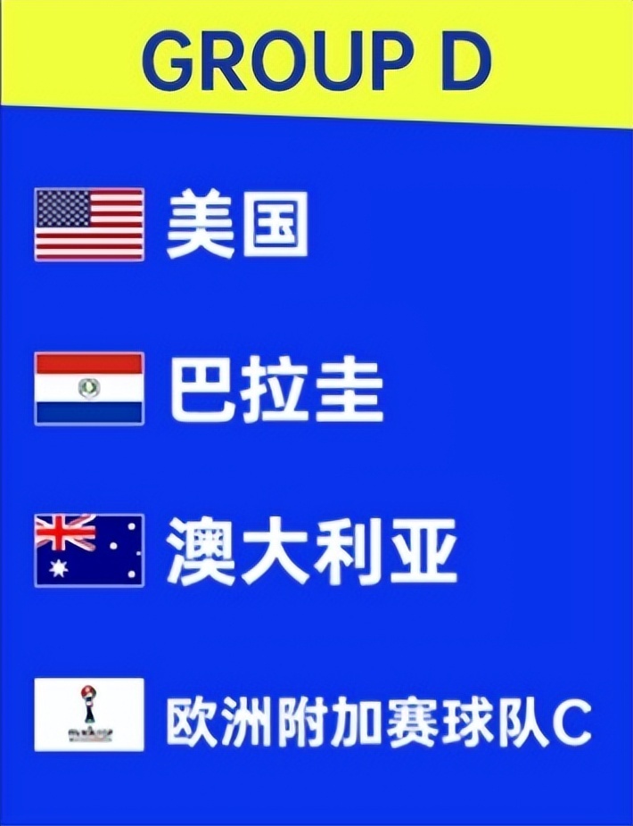 D组包括美国、巴拉圭、澳大利亚、欧预赛附加赛C选手(土耳其VS罗马尼亚、斯洛伐克VS科索沃)。相比其他两个主办方(加拿大、墨西哥),美国的签运“稍差”,巴拉圭及澳大利亚是有实力且有经验的世界杯“老人物”了,的确是能够给他们造成麻烦。土耳其如果晋级正赛更是如此。这对波切蒂诺来讲是个问题。