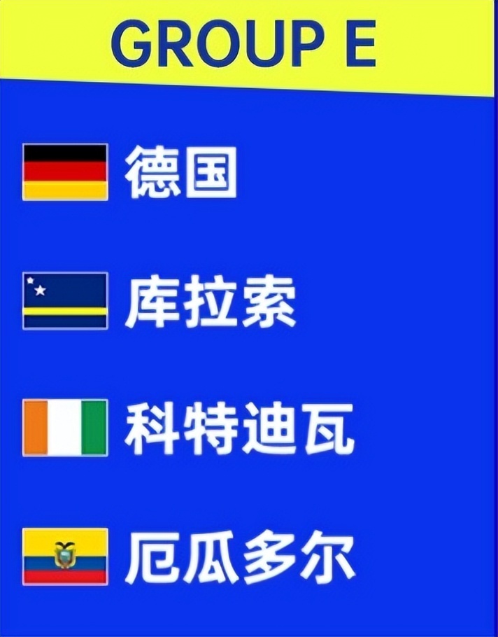 E组包括德国、库拉索、科特迪瓦、厄瓜多尔。对德国来讲这可是没有任何“借口”了,他们必须晋级这是近几届大赛来、成绩糟糕的要求,也是本届遇到不够强对手的“助力”。库拉索几乎没有跟其他对手相拼能力,他们只是吃到了扩军红利。科特迪瓦、厄瓜多尔争夺第二更加“合适”。