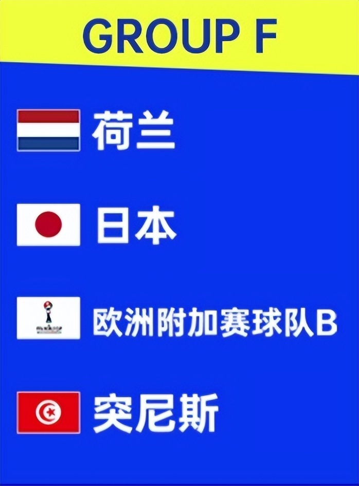 F组包括荷兰、日本、欧预赛附加赛B选手(乌克兰VS瑞典、波兰VS阿尔巴尼亚)、突尼斯。很显然,相比其他组,这组堪称是死亡组。荷兰实力出色在世预赛打出了争夺冠军的水准,突尼斯虽然是低级队伍可是实力不容小视,有基础能力支撑。附加赛选手如果瑞典完成突围那么也会给这几个队带来巨大压力,他们的锋线可是豪门级别的。当然,波兰也不弱的。