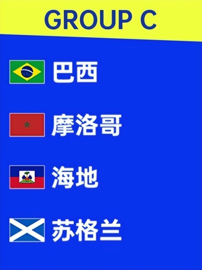 C组包括巴西、摩洛哥、海地、苏格兰。对巴西来讲这可是个特别好的签,除了摩洛哥实力还不错外,其他对手基本是很难制造麻烦,巴西晋级不会太难。在邀请安帅加入之后他们可是要在世界杯大赛出成绩的,起步相对稳是个好事。