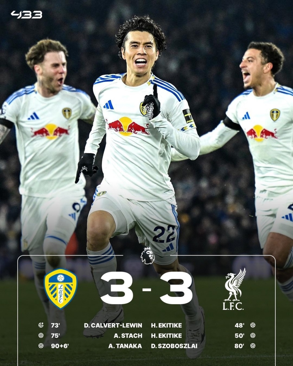 利物浦客场3-3战平利兹联,埃基蒂克梅开二度,科纳特送点,勒温点射,斯塔赫扳平比分,索博斯洛伊破门,田中碧补射阶段绝平。