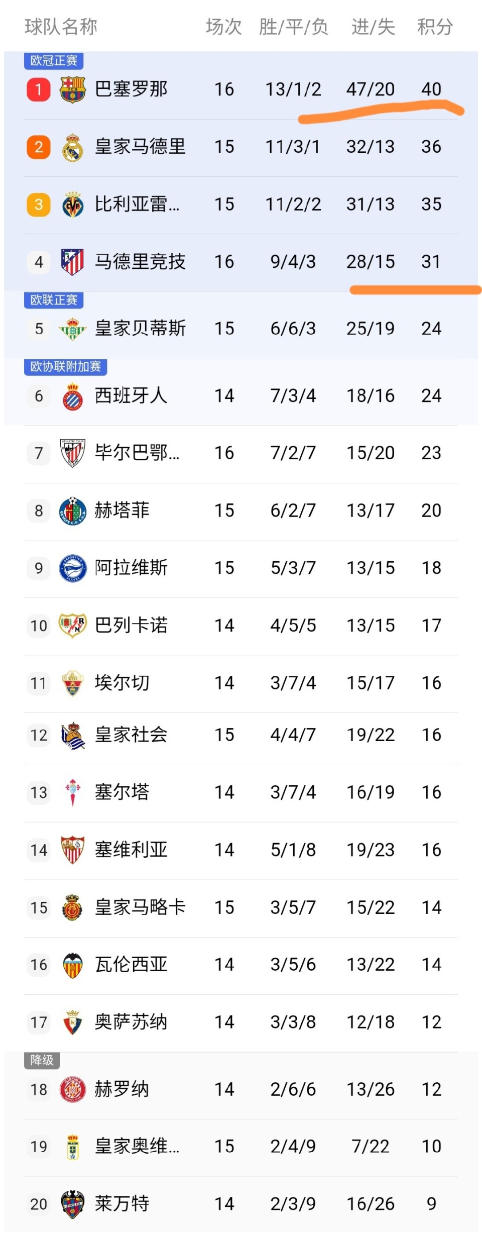 可以看到巴萨积40分了,先赛的情况下领先皇马4分之后,皇马本轮如果输球,那么巴萨将拉大分差,所以皇马本轮面对塞尔塔不可以爆冷丢分啊。第三的比利亚雷亚尔队积35分仅落后第2的皇马1分,马竞积31分落后榜首的巴萨9分,可以看到第一和第4的分差已经拉大到了9分,这个分差还是比较大的,也就是说西甲争冠依然就是在皇马和巴萨之间,比利亚雷亚尔队能否成为真正的挑战者还有待进一步的观察。我们可以看到老牌劲旅瓦伦西亚、塞维利亚排在十名开外。特别是瓦伦西亚逼近降级区,令人唏嘘不已!