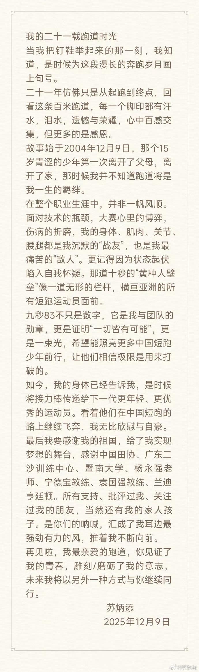 “当我把钉鞋举起来的那一刻,我知道,是时候为这段漫长的奔跑岁月画上句号……我的身体已经告诉我,是时候将接力棒传递给下一代更年轻、更优秀的运动员。”当天,苏炳添在微博发文回顾了自己的奔跑时光,他说,9秒83不只是数字,这是他与团队的勋章,更是证明“一切皆有可能”,更是一束光,希望能照亮更多中国短跑少年前行。