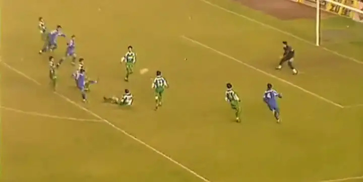 做出扑救姿势,然而球是迅速地射入网窝,让人措手不及。