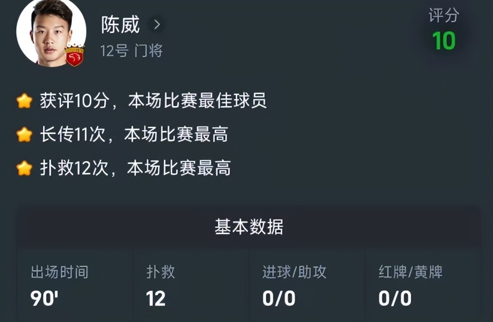 此役,陈威顶替主力门将颜骏凌镇守上海海港球门,真正诠释了什么叫做“叹息之墙”。数据显示,上海海港本场遭受到了柔佛新山的狂轰滥炸,他们一共轰出了47脚射门,其中就有11次射正,但陈威却仿佛天神附体一样,高接低挡,左冲右突,一共贡献了12次绝妙神扑,最终力保球门不失,让对手只能“望门兴叹”。赛后他得到满分的高赞。毫不夸张地说,这场比赛如果不是陈威,上海海港根本不要想保平,恐怕会彻底被柔佛新山打花了,要遭遇一场“惊天惨案”。