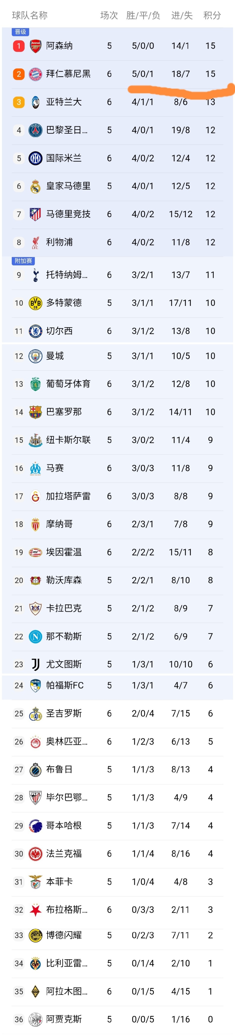 可以看到阿森纳5战全胜,在少赛一场的情况下,积15分排名第一,而拜仁积15分排名第二,而亚特兰大积13分冲到了第三的位置,可以看到亚特兰大虽然在意甲仅排名第12,但是亚特兰大队在欧冠赛场却表现不俗。巴黎圣日耳曼队积12分排名第4,巴黎圣日耳曼队少赛一场,而国米积12分排名第5,皇马少赛一场积12分排名第6,马竞积12分排名第7,利物浦赢球之后冲到了第8。