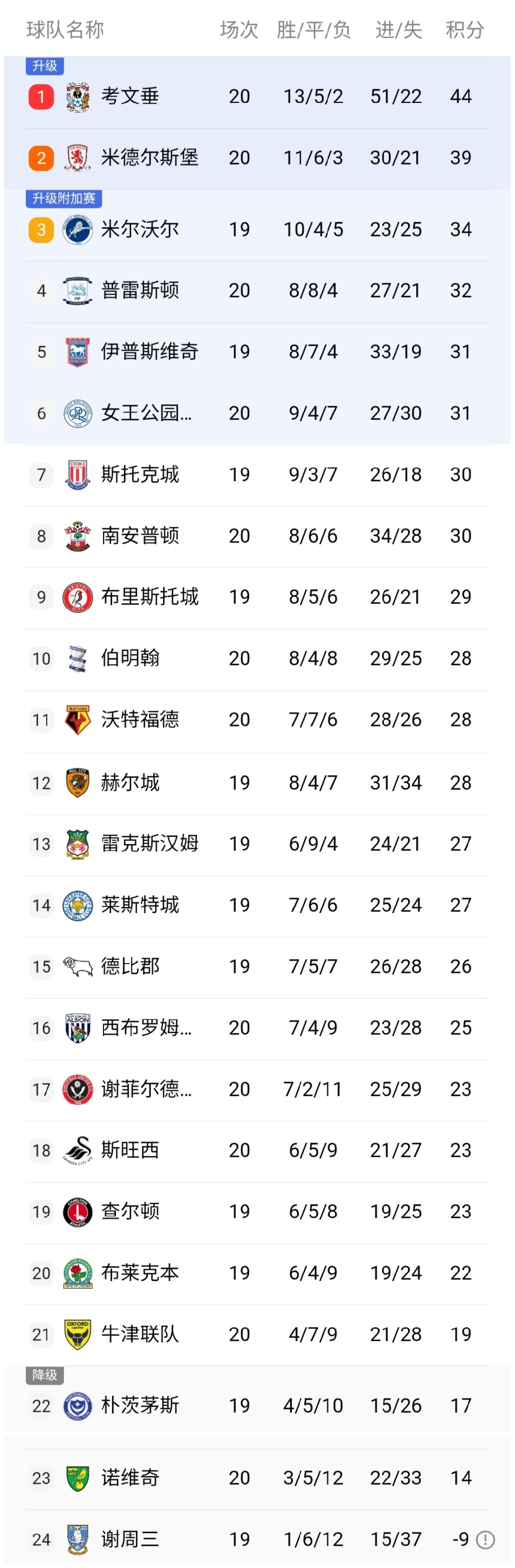 随着考文垂1-1,英冠最新积分榜出炉:英超前冠军沉沦,兰帕德率队领跑+剑指直通英超