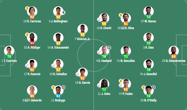皇家马德里(4-4-2):库尔图瓦;巴尔韦德,劳尔-阿森西奥(79'恩德里克),吕迪格,卡雷拉斯;罗德里戈,塞瓦略斯(67'布拉欣-迪亚斯),琼阿梅尼,贝林厄姆;维尼修斯,冈萨洛-加西亚(58'居莱尔)