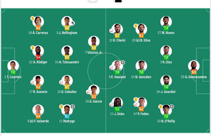 曼城首发:25-多纳鲁马、27-努内斯、3-迪亚斯、24-格瓦迪奥尔、33-奥赖利、14-尼科·冈萨雷斯、20-B席、47-福登、10-谢尔基、11-多库、9-哈兰德。