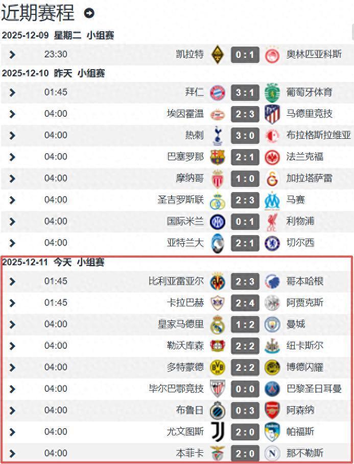 欧冠联赛阶段第6轮次日战况如下:比利亚雷亚尔2-3哥本哈根,卡拉巴赫2-4阿贾克斯、皇马1-2曼城、勒沃库森2-2纽卡斯尔、多特蒙德2-2博德闪耀、毕尔巴鄂竞技0-0巴黎、布鲁日0-3阿森纳、尤文图斯2-0帕福斯、本菲卡2-0那不勒斯。