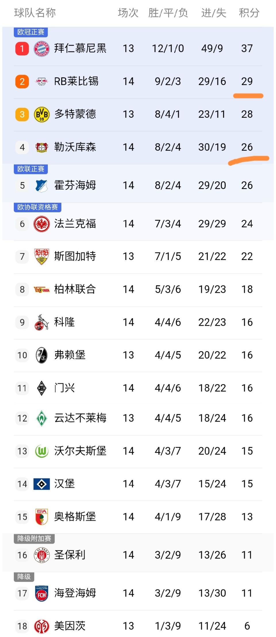 今天凌晨,德甲结束多场争夺,比赛之后,德甲最新积分榜出炉,我们来看看。