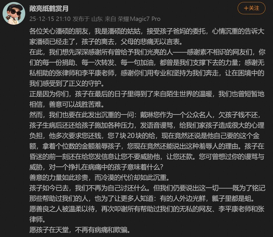 北京时间12月15日,被戴琳拖欠救命钱的山东球迷潘硕的姑姑在社媒发文,确认潘硕已经离世。