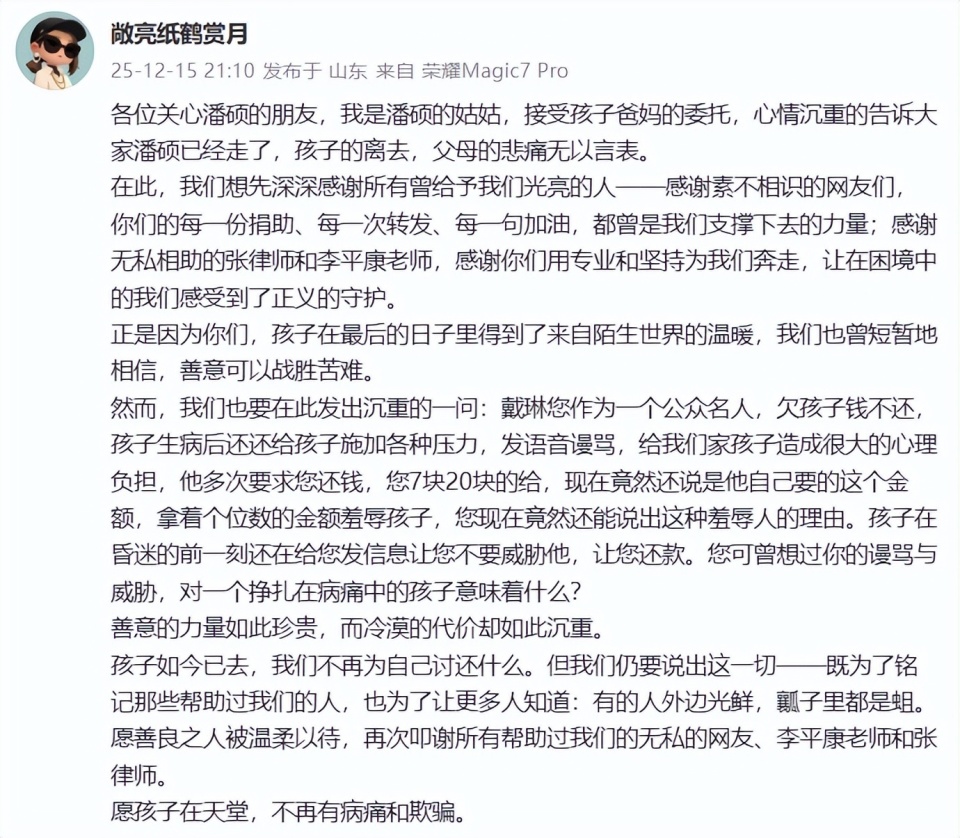 山东球迷小潘因重病离世的消息,让整个中国足坛陷入悲痛与愤怒之中。小潘姑姑的发文确认了噩耗,更控诉前国脚戴琳在小潘病重急需用钱时,不仅拖欠救命钱拒不还清,还曾对其进行谩骂威胁。媒体人李平康此前多次为ICU中的小潘发声催款却无果,如今悲剧发生,网友们怒不可遏,纷纷怒斥戴琳是“杀人凶手”“毫无人性”。舆论的道德审判已然拉满,但更关键的问题是:抛开道德谴责,戴琳的一系列行为在法律层面是否需要承担责任?他的拖欠欠款、谩骂威胁,是否触碰了法律红线?