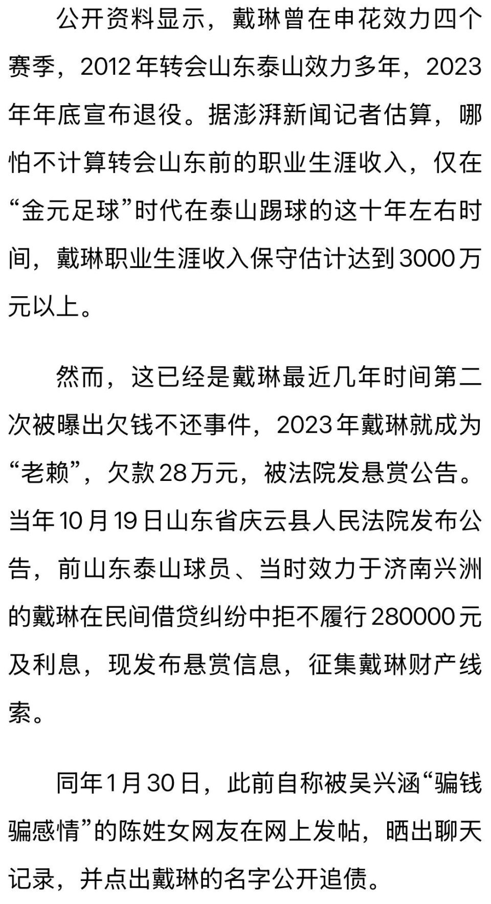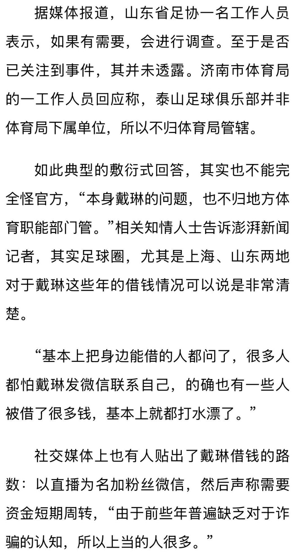 至于收入不菲的前国脚为何会沦落到四处借钱?综合目前情况来看,赌球只是网络传说,至少戴琳没有卷入本次假赌黑风波。另有消息称,戴琳本身也曾遭遇过一起前些年横跨足球圈和体操圈的诈骗案件。”然而不管如何,利用球员身份和前国脚光环去找普通球迷借钱还拒不归还,这绝对是毫无底线的行为,也给中国足球抹黑了。”