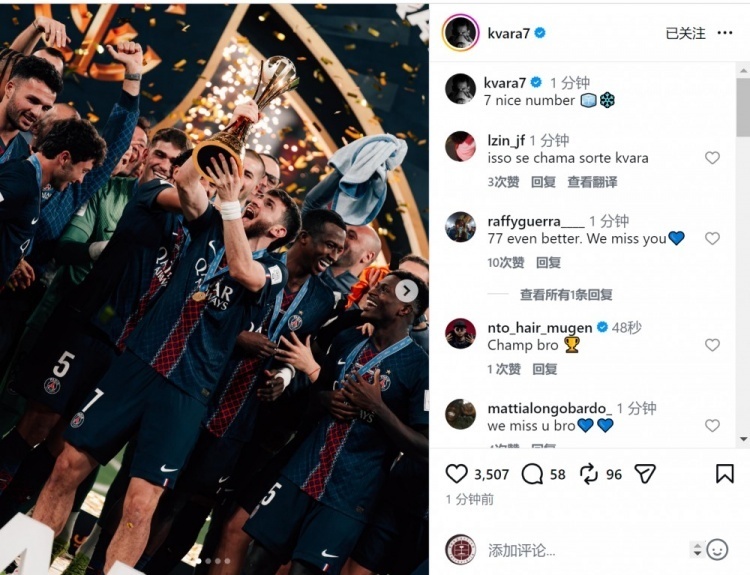 本场比赛首发踢满120分钟的维蒂尼亚当选全场MVP,他赛后通过社交平台晒出与3名葡萄牙同胞队友的捧杯合影,配上六个冠军奖杯表情符号和葡萄牙缩写,分享夺冠喜悦。身披7号球衣的克瓦拉茨赫利亚也晒出捧杯照片,配文“7是不错的数字”,定格荣耀瞬间。