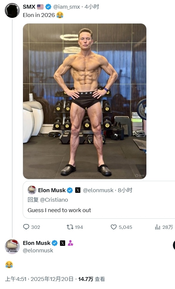 甚至有好事网友将马斯克的头P到了C罗的身上,令马斯克本人忍俊不禁。显然,马斯克即便是全球最富有的人,但C罗那如雕塑般完美的身材,也让他都自叹不如。