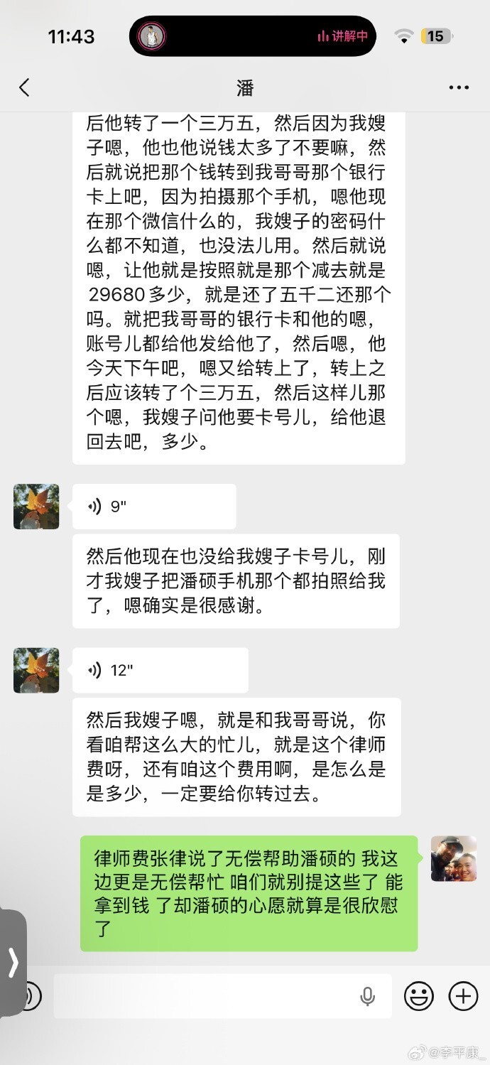 李平康:戴琳已经在今天将欠潘硕的钱还清,还多给了5000多