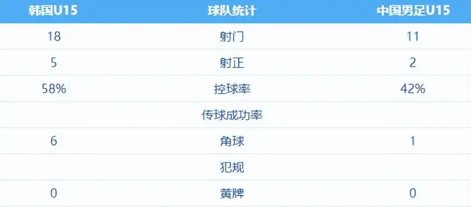 从赛后的数据统计来看,U15国足尽处下风,无论是射门数、射正数还是角球数量和控球率都不如韩国队。而从场面上看,在传控上双方的差距也不小。韩国队的传控相对更加合理清晰,U15国足的球员也在努力配合,但要么传丢,要么目的性不强,变成匆匆的解围式传球。
