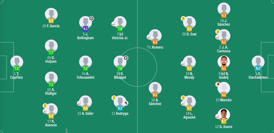 替补未出场:13-卢宁、43-梅斯特雷、4-阿拉巴、19-塞巴略斯、23-费兰·门迪、28-塞斯特罗、30-马斯坦托诺、45-蒂亚戈