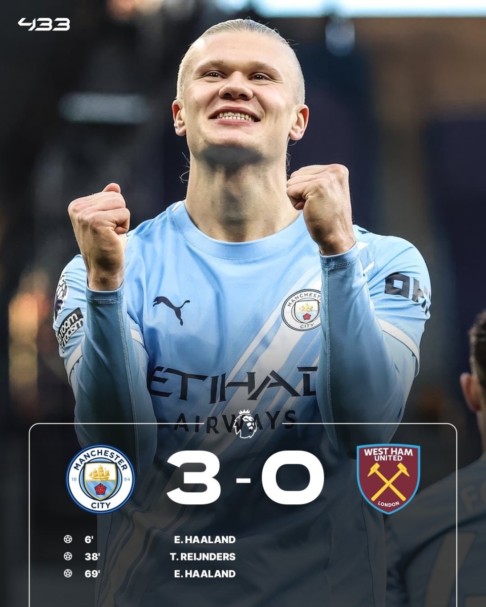 曼城主场3-0西汉姆联,各项赛事7连胜。哈兰德补射闪击得手+头球造险,并助攻赖因德斯抽射扩大比分,哈兰德下半场抽射完成双响。