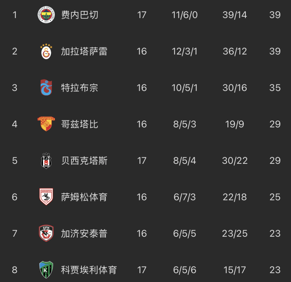 在本赛季的土超联赛中,费内巴切目前11胜6平保持不败,是土超联赛中唯一一支没有输球的球队,也是进球最多的队伍。加拉塔萨雷12胜3平1负,少赛一轮跟费内巴切同为39分,费内巴切暂时领跑。在放弃了穆里尼奥后,费内巴切表现稳定,换帅决定看上去很成功。当然,费内巴切之所以能够有现在的成绩,也与他们加大引援力度有关。