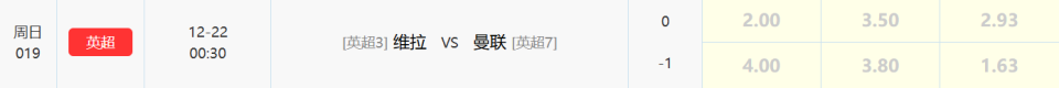 背景线:英超第17轮一场焦点战,维拉对阵曼联。维拉上轮在客场3-2逆转击败西汉姆,拿到各项赛事9连胜,气势如虹。而曼联则与伯恩茅斯踢出一场4-4的进球大战,最终双方各取1分。目前维拉积33分高居第3,而曼联则是26分排名第6,如果曼联想要进入前4,那么与维拉的比赛就显得很重要,因为两支球队是直接竞争对手,双方最近6次交锋曼联拿下5次,优势还是比较明显。